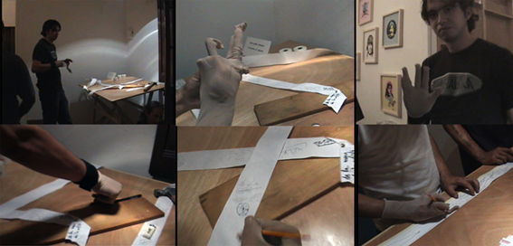 Confeccioné un guante de licra que simulaba, al colocarlo en la mano, la posición del “pintor” (1): formando dos pares separados de dedos, índice-dedo medio y, anular-meñique. El guante modelaba la mano que en lo sucesivo permitía a cualquier persona ejercer el oficio de artista.