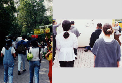 Invitamos a las personas que se reunían ese sábado en el bosque a participar en este juego colectivo, recorriendo los pasillos del parque (entre músicos, vendedores de algodones de dulce, maquillistas, puestos de refrescos, carritos, etc., y todas aquellas personas que disfrutaban de un paseo) hasta llegar al obelisco dedicado a los niños héroes.